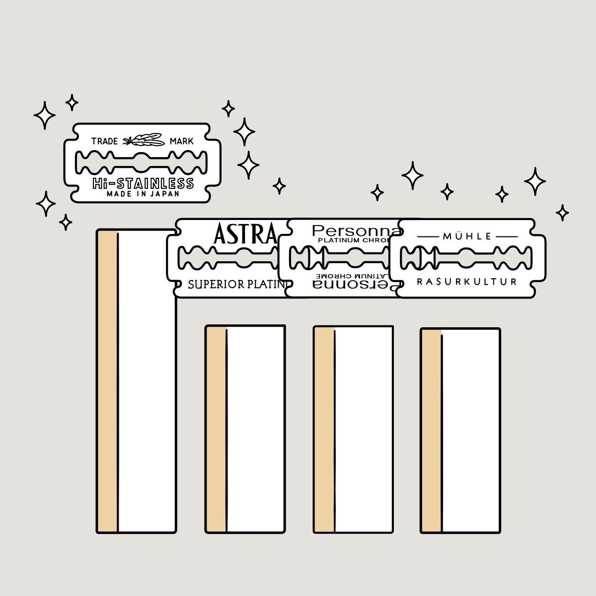 Depending on your own type of skin, the beard growth and of course your personal taste, everyone should try out different models to experience the various degrees of sharpness. As a result, you will have an overview and know which type of blade you need. Now, there are an infinite number of blade types, degrees of sharpness and blade manufacturers. At MÜHLE, however, experience has shown that four blades in combination with MÜHLE safety razors are particularly popular.