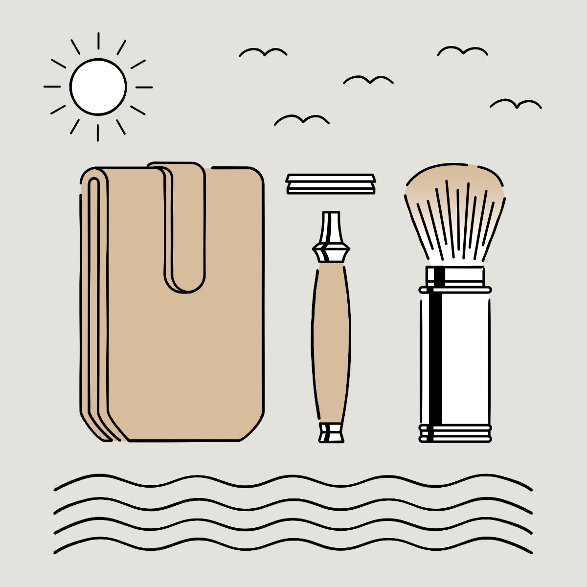The brush and razor are smaller than the regular models for home-usage. Their heads can be unscrewed and comfortably stowed away in the handle. Everything can be packed into an elegant leather case.