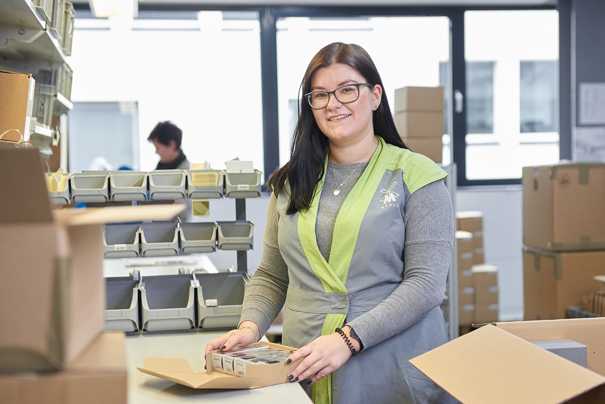 "Shortly after my finishing my school-leaving exams, I got my first temporary job at MÜHLE. I come from the neighbouring village, so I was familiar with the company. I studied business administration and then, at the end of my studies, I did an internship at MÜHLE. During my internship, I did all the jobs that needed to be done in the office, and order acceptance for the most part. On 1 March, I started my first permanent position at the company. I work in the shipping department and I am responsible for financial accounting. As soon as a package is ready for delivery, it comes to me and I prepare the delivery note and the bill. I really like to be part of this company. We have a good working atmosphere, everyone's helpful and we all look after each other. What's more, I'm impressed by the order and cleanliness that we have here. The business management takes good care of us. For example, all women received a bouquet of flowers on International Women's Day. Such a wonderful gesture!"
