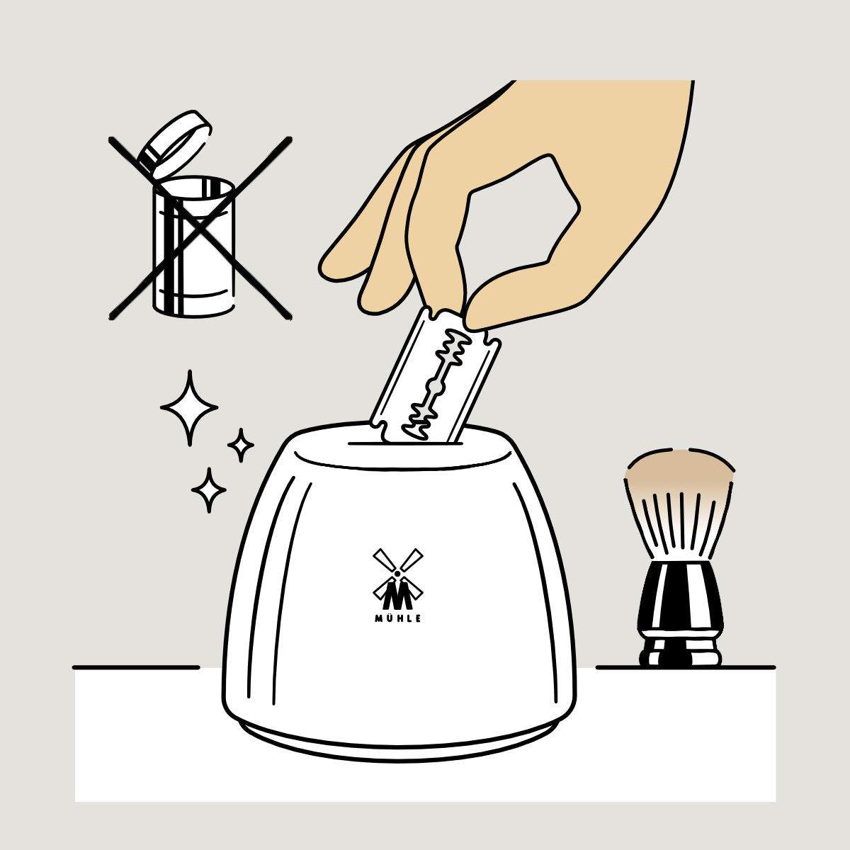 The used blades shouldn't be thrown into the bathroom bin, collect them in a box instead. There are throwaway versions made of metal or - to meet the aesthetic demand - a reusable MÜHLE collecting box made of porcelain. This prevents cutting yourself with the old blades and makes for more secure disposal of waste.
