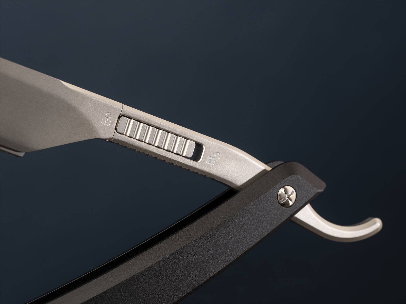 Probably the greatest unique selling point of this new straight razor is its well thought-out, unique mechanism for inserting and changing the blade. The locking system for the blade holder is both simple and ingenious. The hinge at the front can be opened in a single easy step. The CNC-machined contours that you can see inside the blade holder guarantee a perfect fit for inserting a half-blade. When closed again, the spring-loaded slide lock guarantees maximum safety while shaving. The blade is fixed reliably in place and ensures a precise shave.